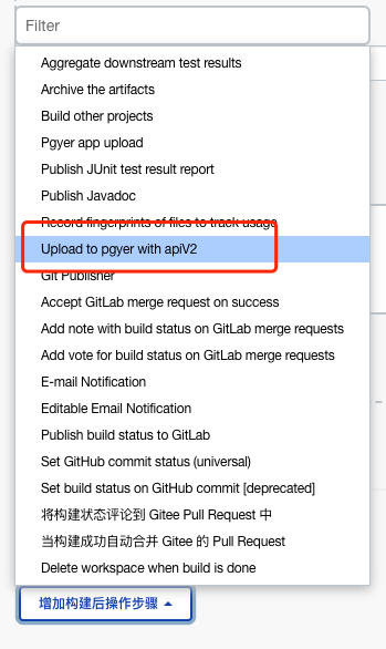 在 Jenkins 的 Job 配置页面 构建后操作 中添加构建步骤 upload to pgyer with apiV2: