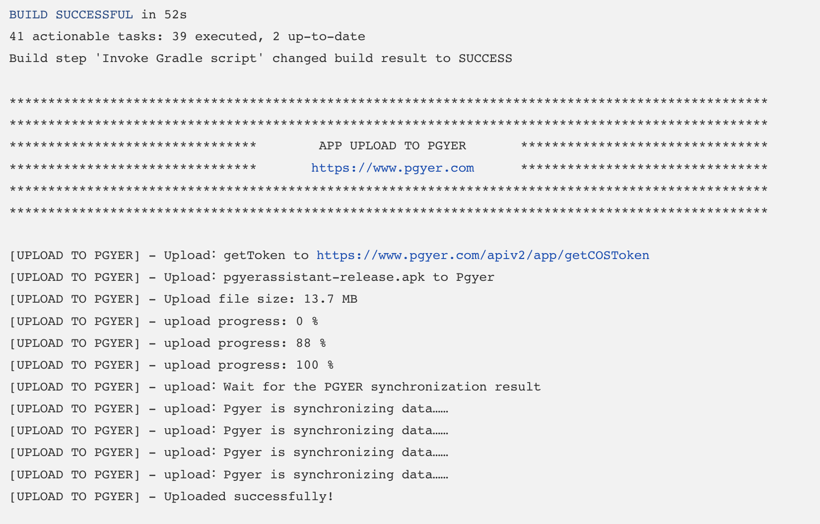 执行构建后,蒲公英上传插件会输出对应日志: